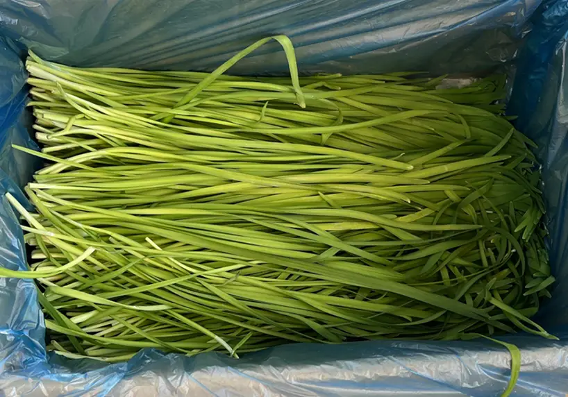 Garlic chives are flat thin slightly dense leaves that have a mild garlic earthy flavor.