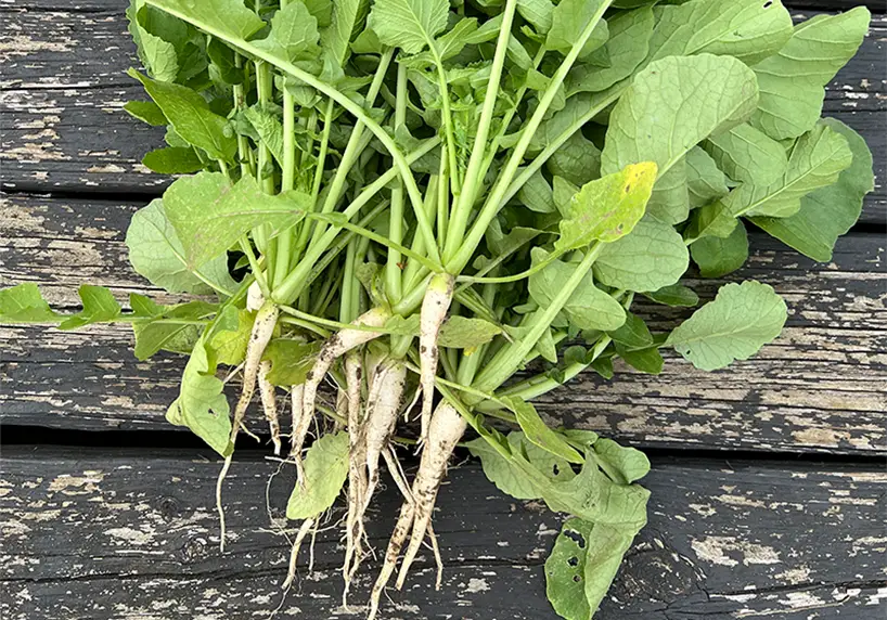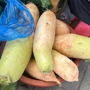 Young radish is often used to make kimchi (Ex. white, spicy/red kimchi, or water kimchi) or seasoned as a side dish (나물). The kimchi made from this radish can be used in cold noodle dishes.