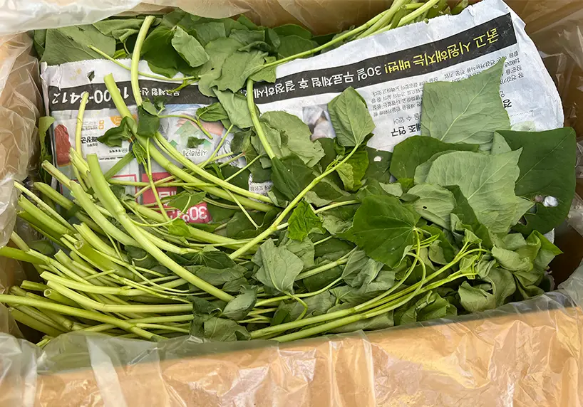 Sweet potato stems are tender juicy stems that have a sweet green flavor. Sweet potato stems are harvested early in the season to ensure tender stems. Sweet potato stems are blanched and seasoned or made into Kimchi.