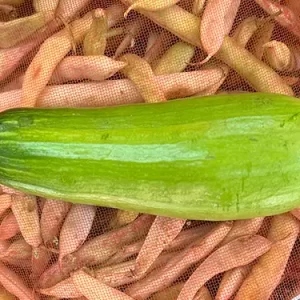 This round squash is deep green summer squash. It is a round shape and looks like a bulbous zucchini. It has a sweet flavor and firm tender meat.