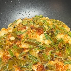 When frying these kinds of pancakes, you should use lower heat. You want to aim for a medium-low temperature. If the heat is too high, the egg will puff up and look unappetizing, and ingredients such as beef or fish will burn on the outside or turn too dark before being completely cooked on the inside.
