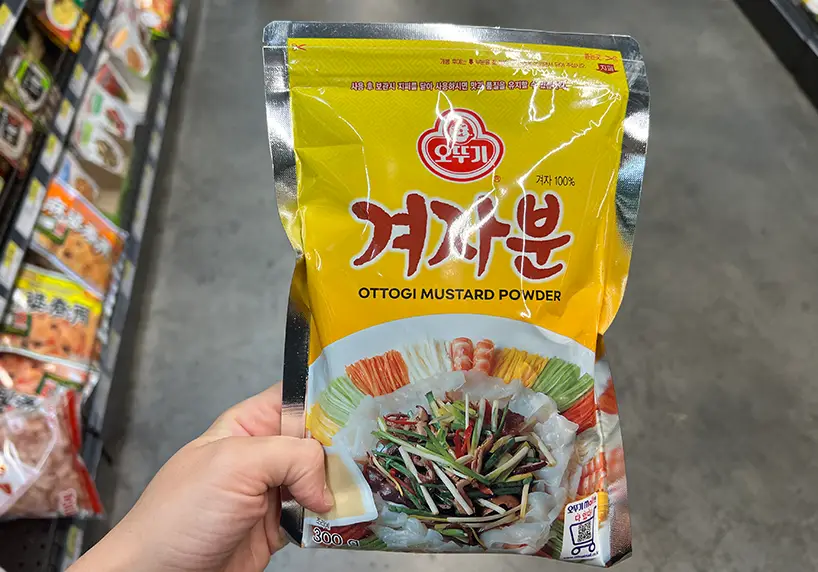 Mustard powder is powdered spicy mustard that you can use dry or mix with water to make a mustard sauce/paste. You can add the dry powder to fried chicken batter. You can add the paste to cold noodles, cold salad (냉채), or platter food (양장피). If you can not find this powder then English powdered mustard is an okay substitute.