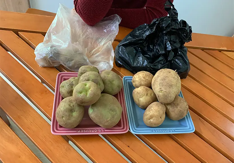 When you store your potatoes in the fridge, they release a toxin to protect themselves from the cold. Please keep them in a box or a cool place outside. There is a difference between keeping potatoes in plastic and a black bag. The black bag will prevent them from turning green.